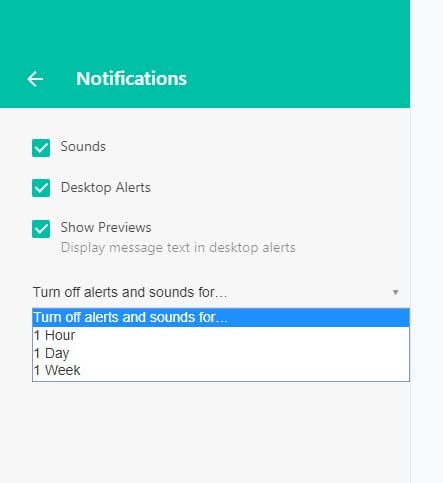 - إيقاف التنبيهات والأصوات لجميع الدردشات لمدة محدّدة. لإعادة تشغيل هذه الإشعارات مجدداً، انقر على أيقونة تم إيقاف التنبيهات والأصوات. انقر للاستعادة في أعلى قائمة الدردشات.